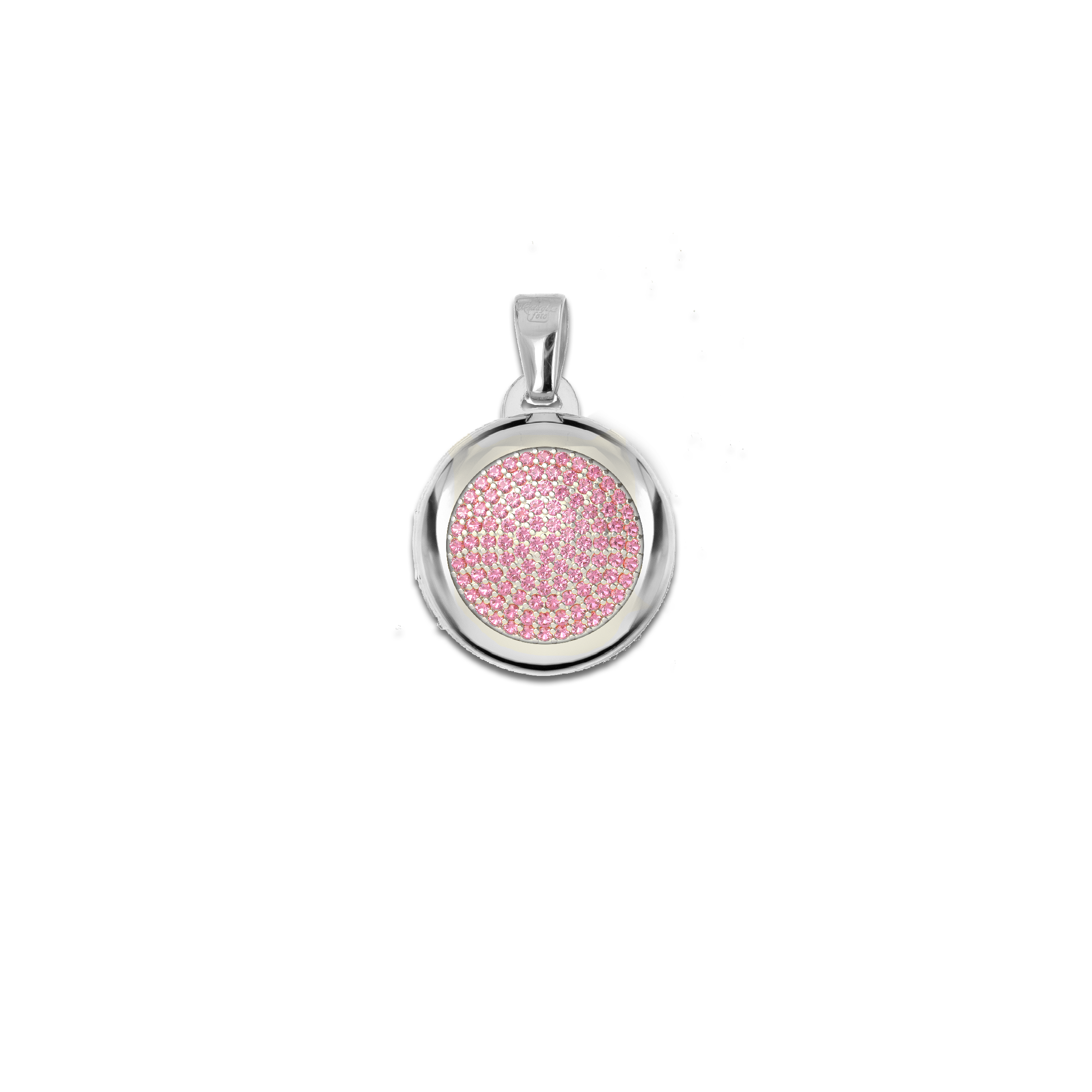 Una luce preziosa custodisce ciò che ami. Questa medaglia portafoto tonda, con scudo ricoperto da un pavé di pietre preziose scintillanti, racchiude emozioni da portare sempre con te.