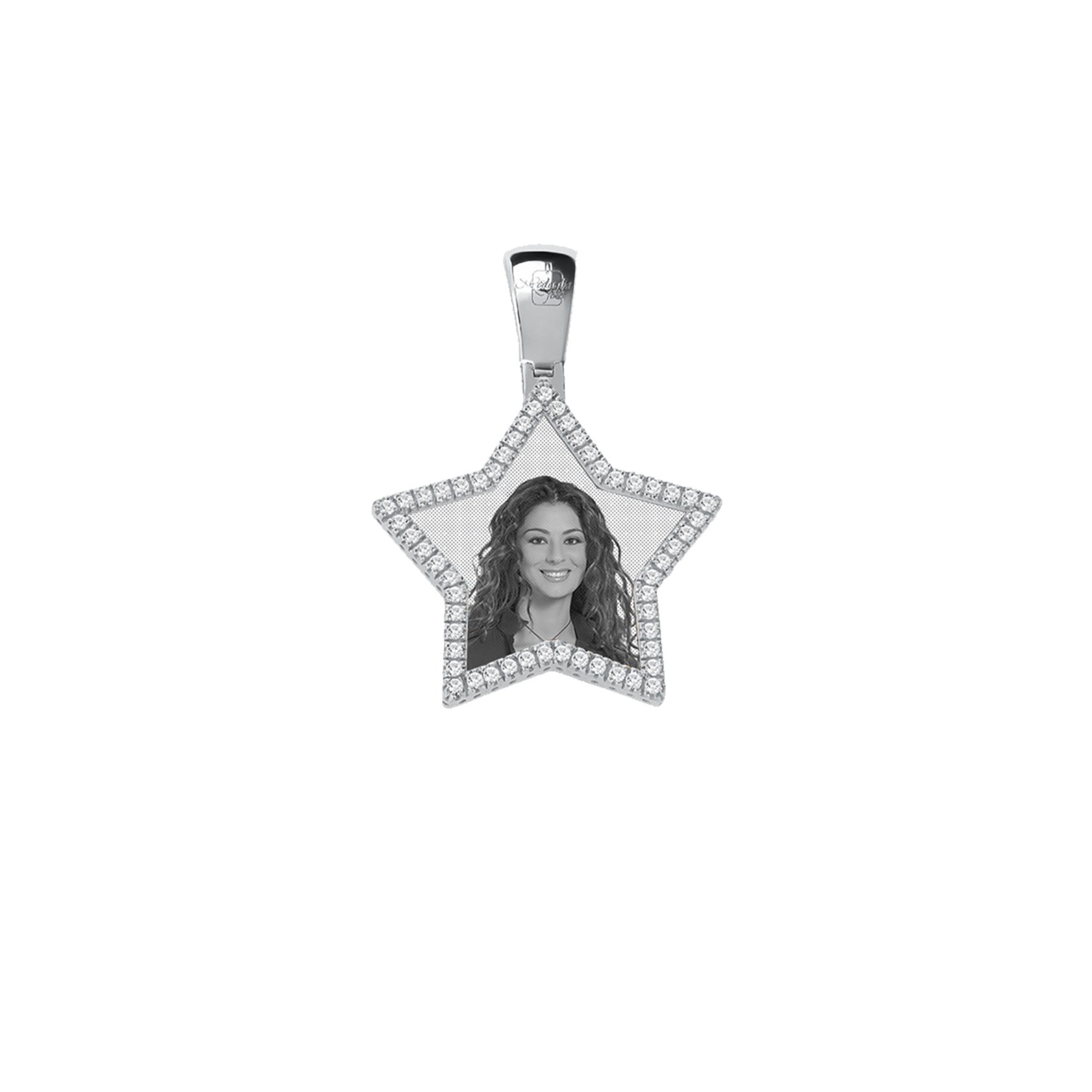 Questa medaglia in oro 18kt a forma di stella è un tributo alla bellezza e ai ricordi più cari. I diamanti che la circondano riflettono la luce, esaltando la sua eleganza. La foto incisa al centro conserva un istante unico, trasformandolo in un tesoro eterno. Un simbolo di affetto profondo, perfetto per un regalo che parla al cuore. Un gioiello che brilla di significato e di emozione.